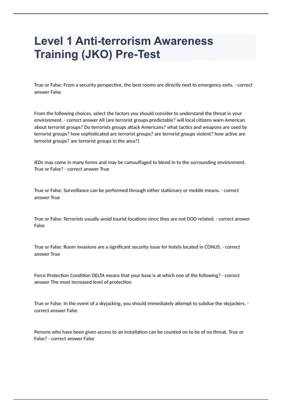 Level 1 Anti-terrorism Awareness Training (JKO) Pre-Test exam with. Trivial in - correct answer True True or False: Surveillance can be performed through either stationary or mobile means. - correct answer True True or , Jko anti terrorism level 1 pretest answers, Jko anti terrorism level 1 pretest answers, Brain activity patterns reflecting security perceptions of female , Brain activity patterns reflecting security perceptions of female , Identified by (4) Ammunition surveillance will perform gaging whenever possible during initial RI or at the next regularly scheduled. PI. Table 2–2